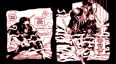 Maybe times were better back then. Less complicated. Less vicious. The Mist displays a skewed sense of honour – killing a would-be rapist – but is also a murderer himself. It’s hard to believe that holding a knife to a young woman’s throat to force the hero to remove his gas mask represents a more innocent time, but it strangely does. Or Maybe Robinson wants to demonstrate that things are not really so different (only that writers are less likely to use hokey gimmicks like ‘an honorable foe’). He clearly advances the same logic in his other Ted-Knight-focused story (in the Annual). The Prairie Witch is a cheesy Golden Age villain with her green skin and witch motif, but Robinson focuses on the darkness in this 1940s foe. The horrors that take place on a small farmhouse in Turk County (human sacrifice chief amongst them) recall all manner of grisly stories about murders and crimes in the middle of nowhere during the time. It just never really came up in the colourful battles in the urban metropolis.