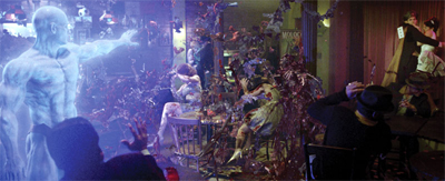 One of the things I noted about the original theatrical cutof Watchmen was that among its problems was the fact that it offered very little in terms of context of the world in which the action takes place. The comic book featured the editorial staff of right-wing journal The New Frontiersmen, the lives intersecting at a news stand, a retired hero running an autoparts store. The problem is – with so much plot in the novel to begin with – in order to condense it down to a more manageable size (under three hours), the creative team had to sacrifice these elements. These three-dimensional characters only venture into the film where the plot demands it: they don’t exist in their own right.