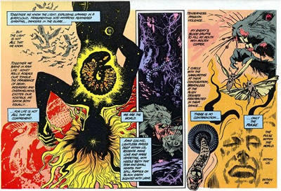 Moore is at his best forming a junction of high-, middle- and low-brow (most obviously in his combination of obscure literary references and trashy popular culture in The League of Extraordinary Gentlemen, for example), and Swamp Thing is a fine example of that tradition. One hand we have structural nods to Dante’s Divine Comedy, but Swamp Thing’s guided tour of the afterlife isn’t given by philosophers and iconic historical figures but The Phantom Stranger, Etrigan the Demon and Deadman (with several other supernatural characters popping on). You’re as likely to see references to obscure scientific experiments (admittedly discredited even at the time of writing) as a fond nod to the bright and colourful Pogo character from the newspaper strips (in the lawyer-friendly guise of Pog).