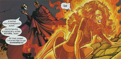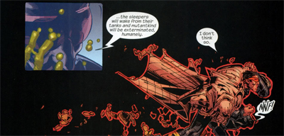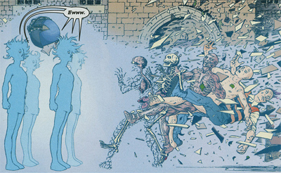 Morrison’s X-men demands to be read in the context of 9-11 if only because the prophetic #115 hit the stands a month before the Twin Towers burnt to the ground, but I think the effects go much deeper. While the DIxie Chicks were being crucified by the corporate media, Morrison was preaching the pointlessness of protest and imitating Nancy Reagan!