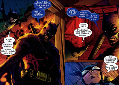 Pretty much the only way Batman R.I.P. is going to make any sense is if you read the previous two trade paperbacks in the Myth Arc. And that one issue where Bruce gets high on weapons-grade heroin and runs around in a red-and-purple Batsuit makes a whole lot more sense as a chapter of a graphic novel than as a standalone issue.