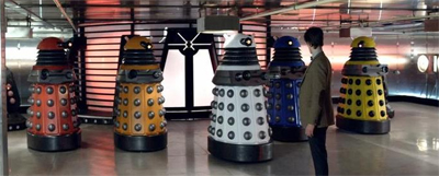 Which is a damnsight more than they got to do during any of the episodes featuring them over the past five years. It happened so often I’m going to take to using the word ‘genocide’ as a verb. Before the new series even started, writer Russell T. Davies asked us to accept that they had been wiped out in an epic skirmish with the Time Lords (who have since also come back, but a lot less frequently because… well, they ain’t half as knaff as the shrill-voiced pepperpots). And then one came back a few episodes into the series (in the appropriately titled Dalek) and proved so deadly and indestructable that it had to kill itself. Then half-a-million of them returned for the first season finale, The Parting of the Ways. Through liberal application of a deus ex machina, they were erased from existence – again. But, like intergalactic cockroaches, they returned for the second season finale, Doomsday, where they were promptly genocided again. Apart from four who escaped to nineteen-thirties New York, where the Doctor promptly eliminated three of them in The Evolution of the Daleks – the fourth one escaping to resurrect the entire race again in time for the fourth season finale Journey’s End before they were promptly defeated and exterminated yet again.