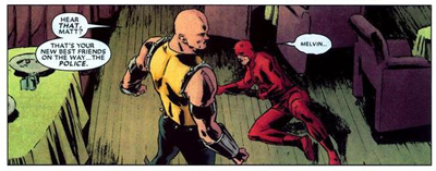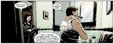Here Brubaker teases us with the idea that he may actually attempt to put the genie back in the bottle – the suggestion that proof would be offered to the world that Daredevil isn’t Matt Murdock. However, he uses the plot device of a second Daredevil operating in Hell’s Kitchen as a device to generate enough legal doubt, but not to completely remove the shadow from Matt’s head (even afterwards he concedes that “a lot of people will probably always thing I’m Daredevil… but at least there’s some doubt now”). However, there isn’t really. Matt Murdock as Daredevil becomes an open secret. After Daredevil goes rogue, the cops flock to Murdock’s house; if they want to talk to Daredevil, they address Murdock.