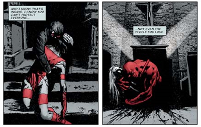 Daredevil’s appeal has always been that he doesn’t necessarily always make the best choices in his life, and that those decisions inevitably come back to haunt him. The contrast between the character’s black-and-white, right-and-wrong Catholic upbringing and the grim moral compromises he inevitably finds himself making are the fodder of great drama and here Brubaker brings the character right to the edge. Although he did passively and unconsciously aid the Kingpin’s plan against him in Miller’s Born Again arc, here Brubaker underlines the character’s capacity to destroy himself – there’s a strong temptation running through here for Murdock to just “give in” and become an animal, to take a side (or a life) or make horrible compromises. When the chips are down and there’s no safety net left to catch you, what the hell can you hold on to in the dark?