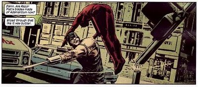 Bendis and Brubaker seem to differ on the cause of Murdock’s suffering. During the previous run it was, to quote Milla, “petty politicians and bureaucrats”, the unconscious and anonymous will of the city itself grinding him to dirt. Brubaker, on the other hand, isn’t afraid to acknowledge that the danger can also come from conscious and aware sources – Daredevil is a superhero, and he does have enemies. The threats are no longer the mindless functioning of the system, but the clear and targeted ambitions of his adversaries (“it’s personal,” Ben Ulrich assures us). Indeed, the final two arcs – To The Devil His Due and Without Fear – essentially find Murdock again a microscopic cog in a grand plan to tear his life apart. That’s not to imply that the character is reduced to the clichéd tedium of regular costumed heroics – the run features more than its fair share of excellent ideas and continues the deconstruction of Matt, particularly looking at the implications of the fact that he inevitably picks himself back up, no matter what he loses (“He’s a survivor,” an adversary observes at one point, “That’s his curse, really…”).