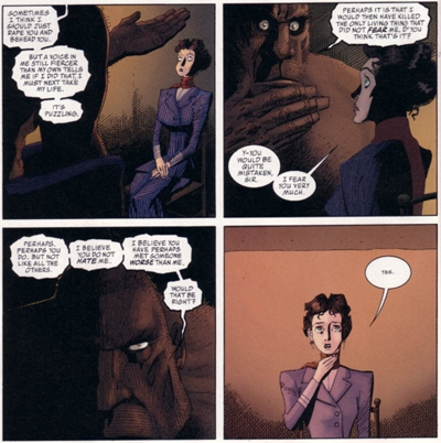In the last volume, he played with gender, but here it’s all about sexuality, the logical conclusion of that piece of thought. Be it the sexual frustration shared by the lead characters and those bizarre creations of Morneau (who resemble everything from Wind in the Willows characters to Rupert the Bear, for added nightmare fuel) or the suggestion that it was Jekyll’s shame over his own sexuality that got him into this “shared body” situation, Moore seems intent on hammering home the repression of the time. It’s decidedly uncomfortable (indeed, a lot of the collection is), but it’s certainly effective. I almost felt a need to take a shower after finishing the book, which would probably make the writer smile more than a little.