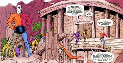 The story is relatively pedestrian, like a great many others in the collection, but it’s carried off with a great deal of skill. The plot essentially follows Rex and his team as they discover a “lost temple” housing “the legendary Star of Atlantis” in a “hidden valley” in the Antartic (or, as one summary puts it accurately enough, “You know. The usual.”). “Any dinosaurs?” Rex asks, clearly fairly familiar with how this will go. “Possibly a couple,” Stagg concedes. “Neat,” Metamorpho replies. As they venture into the temple, they face a whole host of conveniently-elemental-themed death traps and “a mysterious villian”.