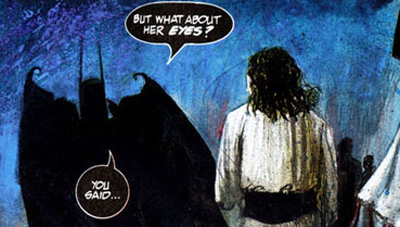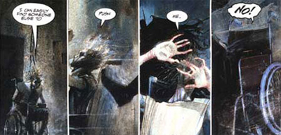 The other villains encountered all fit similar archetypes – Killer Croc as “the dragon within” “the Dark Tower”; Clayface, here rendered as seeking to “share my disease”, harks back to Batman’s description of the Joker as a “filthy degenerate” – he is literally filthy and degenerating; Doctor Destiny, a mostly forgotten character, is the lord of dreams and nightmares (“all he has to do is look at you and you stop being real”). There’s a popular theory which suggests that Morrison’s Arkham Asylum fits in continuity somewhere after either A Death in the Family (where the Joker kills Robin) or The Killing Joke (where the Joker cripples Batgirl), an observation which suggest why Batman is so “tetchy” (“Don’t touch me!” he yells at Clayface; “Take your filthy hands off me!” he warns the Joker), though it might simply be a reaction to the fears he confessed to Gordon about going into the madhouse.