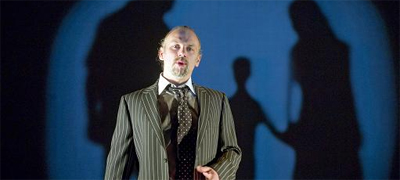 Jumping the Sharks is a small, quirky play. Essentially a one-man one-act play following the triumph and decline of a Hollywood big shot as he waits in what must be limbo while outlining the seven core stories, it banks a lot on the central performance of Don Wycherley. Wycherley, an actor you might recognise from Perrier’s Bounty or Sweeney Todd, gives the play his all as former television executive and now dearly departed Nick Cross, managing to seem a convincing and charming conversationalist on a sparse stage. His delivery is truly impressive, inviting the audience to overlook some of the sleight of hand the play uses, and helping the hour breeze by.