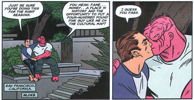 Ignoring the Spike’s obvious instability, the other Spike (the team’s owner) is unable to justify keeping him off the team, lest they be labeled politically incorrect. “We can’t afford to have X-Force seen as a racist institution,” he explains, leading to a ridiculous situation where the team is forced to have a second token black person on the team (because having one makes it look token). On a related note, it’s nice to see Milligan actually taking the time to show us some homosexual characters in mainstream comics – there have been a few token examples over the years, but it’s still all too rare to find an LGBT character in popular Marvel or DC book. Milligan does play with the sensationalism of our fixation on a given character’s sexuality (he teases us with revealing a character’s orientation before remarking, “none of your damn business”), but he also displays any number of characters for whom their sexuality isn’t a big deal and doesn’t define them. It’s kinda sad that this is remarkable in this day-and-age, but unfortunately it is.