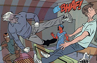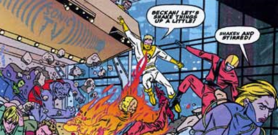 Milligan and his artist Mike Allred are clearly having a fantastic time with the material. These are a bunch of superheroes who employ publicists rather than butlers, or have reporters on speed-dial rather than law enforcement. Everybody on the team has an angle, even the strong and silent type. “I’d like to talk,” the strong and stoic Ram advises his team leader, “About my role.” Of course he does. To describe the team themselves as high maintenance is an understatement of massive proportions. “I hate you! I hate you all!” the drunken Gin Genie yells as her colleagues backstage in a paranoid rage. “You’re trying to destroy my fanbase!” When the CIA wants to blackmail the team into doing something, they don’t threaten to kill Guy, they simply threaten to assassinate his character.