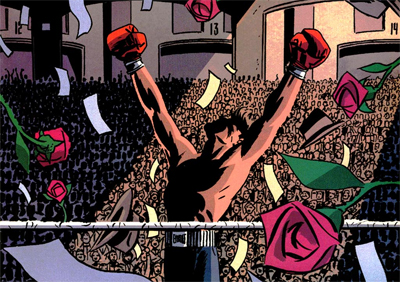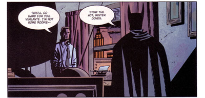 More than that, there’s the simple use of iconography. Cooke’s second chapter features a full-page splash of Superman hammering Batman into the ground (with the commentary that “Photo taken seconds before the Bat-Man defeated Superman with an explosive charge. After several well-placed boots to the solar plexis, the Bat-Man made good his escape.”) – an image which owes more than a slight debt to a similar Batman-Superman bout in Frank Miller’s The Dark Knight Returns, a comic which is general credited with launching “the dark age” of comic books. Of course, in Miller’s book the fight was very real. Here, Cooke reveals it was “staged”. The implication here is that true superheroes would never truly come to blows.