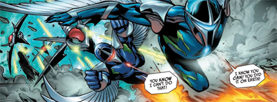 The Ascension miniseries cuts in and out of the main narrative, most of time in very clever ways. When I read the War of Kings miniseries and then read the Ascension miniseries, the scenes actually worked quite well together – I got the idea that I was receiving an extended and textured narrative. It all fits together surprisingly well, despite the fact that any person just reading the two Darkhawk issues would have a tough time relating them to the main plot.