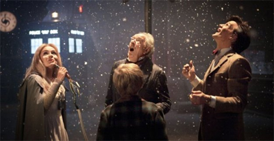 Ignoring the time travel dynamics inside the story, it actually worked best as a continuation of Moffat’s key themes. After all, since he’s spent his entire first year moving towards Davies’ portrayal of the Doctor as almost (but not quite) human towards a style of modern fairytale – so A Christmas Carol seems perfect fodder for his first Christmas special (although I am surprised at how far the script went out of its way to secularise Christmas – it’s pretty much made interchangeable with “winter solstice” and described as “half way out of the dark”, which seems to ignore the religious undertones of the holiday as well as being completely incorrect).