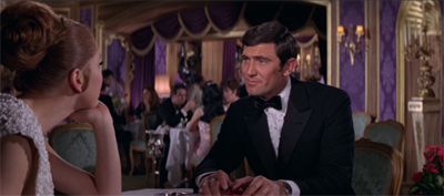 In fact, Lazenby’s Bond seems almost afraid of girls. It makes an interesting change of pace from Sean Connery’s sexual predator, but it also makes him seem somewhat wimpier and more insecure. Don’t mistake this for the film being any less sleazy, though. After all, the Contessa literally introduced by her breasts (at the casino) – okay, we’ve already met her, but still. Lazenby appears to be caught off-guard by the Contessa. His banter with her – “please stay alive, at least for tonight” – is somewhat awkwardly delivered, like he doesn’t know what to say.