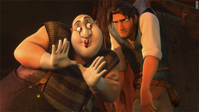 Tangled is an unashamedly girly film. Disney was reportedly concerned about selling the film to young boys but, c’mon… that’s what they bought Marvel for. The film revels in the feminine, while firmly rebuking conventional masculine notions. The local rough bar, “the Snuggly Duckling”, is filled with hordes of what are seemingly Viking warriors (what they’re doing drinking in a continental European fairytale, I don’t know – maybe they’re Goths and Visgoths with fashion sense) who – underneath their gruff exteriors – just want to live their lives free of the stereotypical masculine ideals of violence and confrontation.