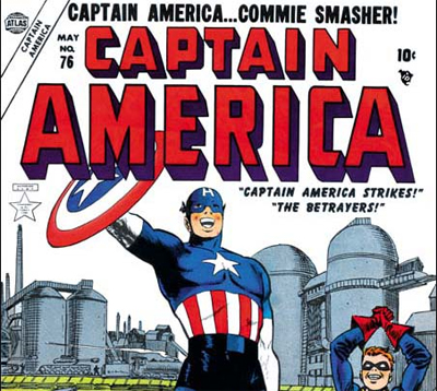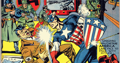 A: Yep, Captain America was original published by Timely Comics in 1941. He memorably introduced himself by punching Adolf Hitler in the face. Months before America officially entered the Second World War, too.