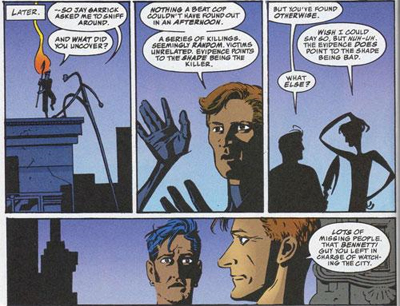 I’ve remarked before, but Robinson has done great work with Opal City. Over the run, through clever exploration of the city’s urban legends and the wonderful Times Past issues, Robinson has built a rather detailed sketch of the fantasy city. Here in particular he seems to acknowledge something that even the design and architecture make clear – Opal City probably couldn’t actually exist. It’s a paradox, a magical fantasy. Cowboys and pirate mingle in the city. Even Culp, the murderous dwarf, remarks that he was difficulty figuring out “where it was… east n’yet inland just enough…” It’s ftting that Jakc leaves his comic book behind by moving to San Fransisco, “a real city.”