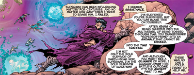 The other main villain of the piece is the Time Trapper. He works well as a bad guy because he’s pretty much the embodiment of a continuity revision – he stands in for all the continuity-heavy rewrites which have damaged the Legion over the years (which allows him, for example, to fit in with Johns’ portrayal of the Reverse Flash). He’s a “giant cosmic reset button”. Indeed, his identity is itself subject to the same sort of editorial mandated rewrites which have made the Legion’s continuity so tough to follow. “His own history changes,” Brainiac suggests, “I’d guess even his identity could alter, as the true timeline marches on.” When he remarks that “I attempted to remove any true memories of Superboy from the Legion”, he’s pretty much speaking as the embodiment of DC editorial policy when they attempted to erase the Legion of Superheroes from Superman’s history.