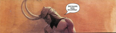 And so, without any obvious metafictional intrusion (or clear reference to the nature of the comic book we’re reading), Robert Rodi makes a rather wonderful point. Villains fail, they always do. They lack free will, because they are figments of our collective imagination – they can never really be more than they are. This revelation terrifies Loki, and throws him into a rage against his subdued brother. “Must I accept this?” the god demands of Thor. “Must I believe that from this abject state, my brother can, and will, rally? That from this depth of misery he is destined to rise to even greater heights?” It must suck to be a comic book villain. After all, he’s witnessed “a thousand thousand battles, all ending in the same manner: Thor triumphant, Loki vanquished.”