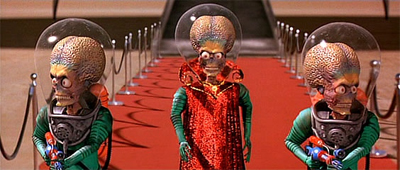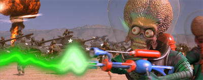 It’s hard not to warm, just a little bit, to creatures who decide to go bowling on Easter Island, or throw a Martian snowglobe into the war room just to mess with everybody there, or carry speakers around while vapourising freely, loudly declaring, “Don’t run! We are your friends!” Hell, I can even sympathise just a little bit with their particular weakness, as revealed at the end of the film. God knows I can’t stand it either. Add that to the fact that their visual design is just wonderfully hokey and old-fashioned, and they are easily among my favourite aliens of all time. in fact, I suspect these monsters decided to invade Earth not for our water or anything like that – they were probably just bored one afternoon and looking for something to do. Oh, those adorable little psychotic rascals!