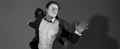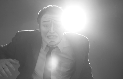 Paul Reid plays Farrell Blink, a small man with a lot on his mind. Dressed and made up like a mime, Reid’s character is mostly mute (save in flashbacks or internal dialogues), relying instead on his actions and a wonderful selection of sound effects (all produced by the actor) to get everything across. The set is bare, there are no props – there’s only a giant screen showing a variety of backdrops, animated with great care and skill. It’s up to Reid, with vocal talents that seem to rival Michael Winslow, to create atmosphere and mood, illustrating perfectly what’s going on.