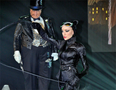 Still, I can’t help but feel that the performance suffers a bit from trying to mish-mash so many of the particulars together. So the story of the thing feels like a slightly campy Adam West adventure, with a supervillain team-up, a Catwoman who can’t decide if she’s good or bad (and who gets shipped to Arkham despite not actually being insane), a Joker who lowers himself on to the stage using helium and “Joker bombs.”However, the tone seems to be set for the neo-gothic style that Tim Burton brought to his films – it’s most obvious in the design of the Penguin, but also in the music that draws heavily from Danny Elfman, and the set design and costuming, which belongs in that sort of strange art deco fantasy world that Burton defined.