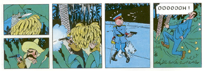 So there’s the wonderfully random subplot about the blow-in Tintin somehow ascending to the rank of advisor to General Alcazar. It’s like something out of a thirties comedy of errors, and there’s more than a hint of slapstick about the dueling assassination attempts that inevitably backfire, often without Tintin’s direct knowledge. There’s a sense that Hergé had a lot of fun writing the story, with plot points like a parrot that identifies a murderer and an explorer with the “pet hobby” of ventriloquism. Hell, I love the fact that the natives speak in a barely-discernable Cockney dialect.