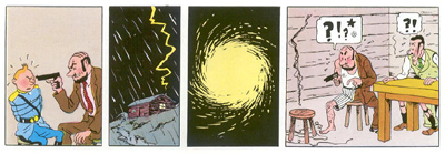 It’s curious to see Tintin as much more of a badass here. Catching a goon breaking into his house, Tintin has a gun drawn, and sits down in a comfy armchair. All he’s missing is a brandy. When the crook accuses the reporter of stealing his bird, Tintin calls his bluff. “Really? Go right ahead. There’s a phone; ring the police…” It’s quite possibly the most hardcore I’ve seen Tintin, and it’s a strange little moment.