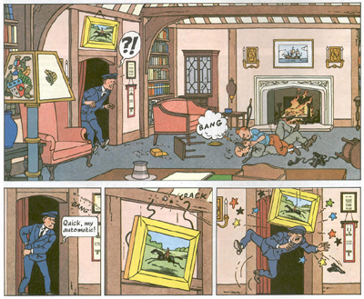 Speaking of international, I rather like Hergé’s portrayal of the United Kingdom here. Given the way I responded to Tintin in America, one might think that I’d be even less interested in an adventure set in our closest geographical neighbour, but I actually think Hergé manages the locale a lot better here than he did in his hero’s trip to North America, a country seemingly populated with cowboys, gangsters and Native Americans. His United Kingdom is relatively understated, as much as the artist loves drawing his fields and his British police officers. Indeed, the keep on the eponymous isle are brilliantly evoked, from somebody who familiar with the ruins of the British Isles. There are some nice touches like the road signs or the quaintness of the local fire department, but none of it screams of a knowledge of British culture drawn from the movies.