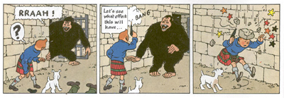Anyway, Snowy has always been arguably more efficient than his master, and possibly more quick witted. This story doesn’t represent the first time that he’s intervened to save Tintin’s life, but he does so with astonishing frequency here, saving our lead from a burning building or a faked suicide attempt. Indeed, the collection offers perhaps the definitive Snowy moment, as the little white dog manages to scare the heck out of a giant gorilla. It’s no wonder that Snowy ends up with a taste for the whiskey, and it’s slightly unfortunate that Tintin feels the need to physically discipline him here – after all he’s done. After all, Tintin was only moments ago singing the praises of “good old Snowy!”