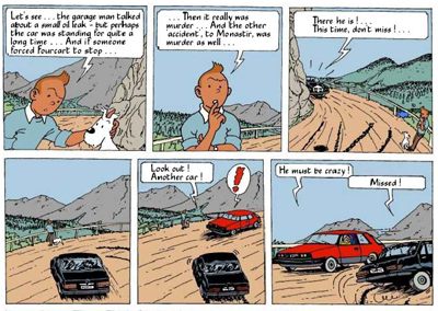 Indeed, the story actually makes reference to Tintin’s job for the first time in quite a while. “My name is Tintin,” he introduces himself. “I am a journalist.” Later on, he explains, “I’m a journalist and I’m making enquiries about the accident in which Mr. Fourcart was killed.” Given that his profession hasn’t really been discussed in quite a while, it feels strange to see it brought up so frequently, a sign that Hergé himself was harking back to the earlier adventures. Despite the subject matter, there’s nothing especially post-modern about the way that Tintin stumbles across the mystery. In contrast to most of the later adventures, Tintin isn’t sought out or doesn’t discover it through awkward plot contrivance. Instead, he falls back on the old plot device of reading about a murder in a newspaper. It’s a nice touch that harks back to those earlier adventures.