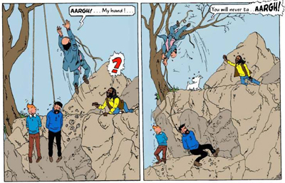 Nostalgia does allow us to forgives some of the more obvious and awkward moments in the tale, as we concede that this is the last opportunity we’ll have to read about a Hergé-plotted Tintin story. In particular, there’s a beautiful little sequence where Tintin, falling unconscious, has a dream that takes him through his years of adventures – we see moments from The Cigars of the Pharaoh, Flight 714, The Blue Lotus and Tintin in Tibet, with artwork that evokes some of Hergé’s trippier sequences. Indeed, the final fate of Rastapopolous calls to mind both Tintin in America (where our hero is lynched) and Cigars of the Pharaoh (where the villain suffers a similar fate).