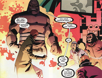Anyway, Lex regards Bruce’s funding of Batman as a fatal character flaw. “You think you know somebody–!” Lex remarks, “He’s letting down the human race.” It reminds me of the sequence in Lex Luthor: Man of Steel, where Bruce provides Luthor with kryponite, underscoring the fact that both characters are essentially Promethean – they both stand for the triumph of human accomplishment, and both fight against threats to the human world. However, while Batman is prepared to take Superman down if necessary, Lex doesn’t even have the capacity to see past his own xenophobia and racism.