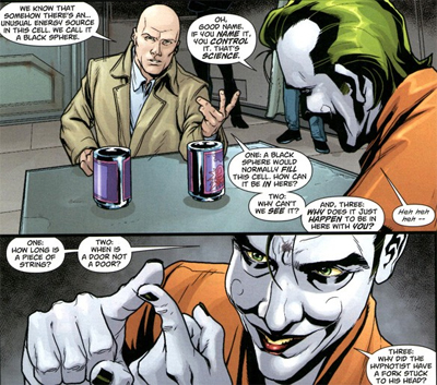 Not only is the Joker aware of how the story will end, but he’s aware of Luthor’s central character flaws that will lead to “the biggest joke of all time.” It’s quite something when a mad clown is more aware of your flaws than you are – and the Joker urges Luthor to respond to it in-character. “For my sake,” he insists, “for all I stand for, when that opportunity comes along — take it seriously!” The Joker is able see the world from Luthor’s perspective, and insist that Luthor “take it seriously”, something that the Joker could never do.