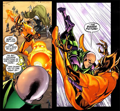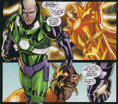 Tying back to Blackest Night, Cornell has Larfleeze cross paths with Lex, and reveals that Luthor’s greed eclipses even that of the Orange Lantern. In one of the nicer character moments of one of the better DC crossovers of recent years, Luthor was deputised to serve as an Orange lantern, an agent of avarice – a rather wonderful little scene in a crossover composed mostly of wonderful little scenes. Indeed, Luthor still seems to yearn for the power of the Orange Ring, despite claiming to be dismissive of it. However, a telling moment occurs when Larfleeze experiences a taste of the power that Lex covets. Larfleeze confesses, “I… do not want that.”