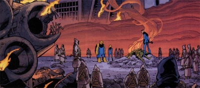 He also gets to plays with some interesting science-fiction devices, even while telling two remarkably straightforward arcs. Doom and N-Zone both have pretty foregone conclusions and are so strongly tied to the mythos as to be predictable, but they do provide Ellis with the chance to window-dress the series with some interesting new wave pop science. Van Damme’s village in Denmark is designed to resemble “that Burning Man thing in America.” “Phase-space” is used as a technobabble cause of the characters’ transformation. There’s even a “fantasti-car” which runs on Ellis’ pet concept, “zero point energy.”