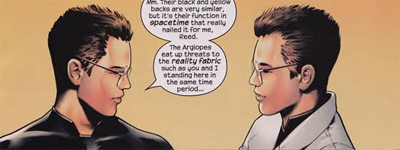 However, what truly and immediately distinguishes Millar’s storytelling from that of his predecessors is how he deploys the high concepts (or, as Reed calls them, “super-concepts”) that one associates with the Fantastic Four. The pilot teased the issue and Ellis was much more concerned with offering a plausible-sounding basis for the scientific work that the characters were undertaking, with everything seeming almost rational. Millar, however, just throws these quick ideas out there to see how many work and how many don’t. There are wilfully ridiculous ideas thrown about with the kind of casual ease that helps underscore just how weird the Fantastic Four actually are. There are baby versions of The Ultimates (the “Mini-mates” to quote Reed)! Watch out for giant time-stream repairing spiders! Victor Van Damme has suggested “we swap minds” as easily as exchanging coats! Oh, there are some time traveling terrorists! At one point, Ben observes something strange while everyone else carries on on their way. “Listen, am I the only one who sees those guys poking a giant maggot with sticks over there?”