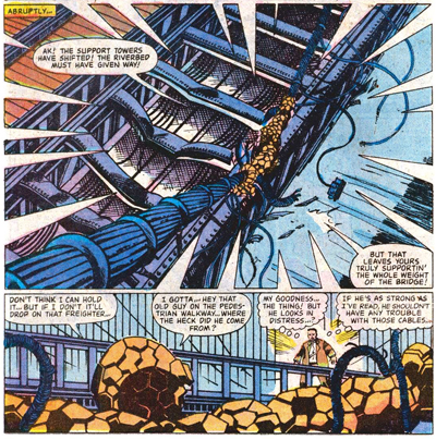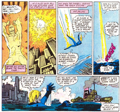 In one great little chapter, Johnny storm finds himself trying to prove the innocence of a man convicted of murder and sentenced to death. In the old days, the idealistic days, Johnny would have solved the murder in time to save the kid. Instead, he has to offer post-mortem vindication for an innocent soul. It puts the Human Torch well outside the role he traditionally plays, and puts him in a world where he isn’t comfortable. He thinks, “The Fantastic Four has no official jurisdiction in any criminal cases. We’ve never been crime-fighters like Daredevil or Spider-Man, either, but…” There’s no “but.” Johnny solves the crime, but is alarmed to discover that it brings the accused’s mother no peace. He can’t understand, and she claims she isn’t surprised. “You’re a hero,”she states, as if Johnny doesn’t belong in this gritty underworld. She’s right.