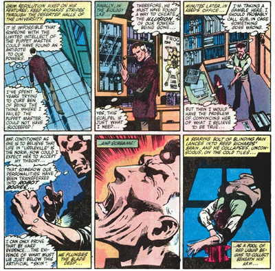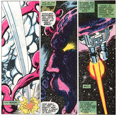 “There’s thousands of them!” Johnny insists. “They’re committing suicide trying to reach us!” Reed corrects him, “No Johnny! The antibodies have no life of their own! They are just cells of Ego’s body. You destroy more ‘living things’ each time you get a haircut.” It seems like a fairly convenient analysis. Later, he has Johnny burn Ego’s “ersatz brain” on his suspicion – seemingly indifferent to the fact that he would be lobotomising a sentient creature if he was wrong. Of course, he’s never wrong, and – as explored earlier – even when he is wrong, there aren’t generally too many consequences.