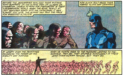 It seems like the type of attitude that suggests that such creatures are not fit to govern themselves – which is disturbingly like a rationale used by many anti-abolitionists in the lead-up to the American Civil War. it has some pretty unfortunate implications, not least of which the simple fact that the Inhumans didn’t try to teach their former subjects to live independently, but just reintroduced slavery as a means of “protecting” their “lesser evolved” brethren. I don’t think that Byrne agrees with any of this, but it illustrates the worrying implications of the logic he might use to return to the status quo. (Similar to the unintentional, but worrying, implications about the resurrections of several Silver Age characters in recent times.)