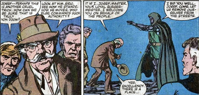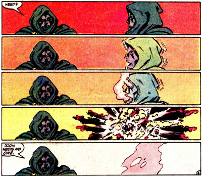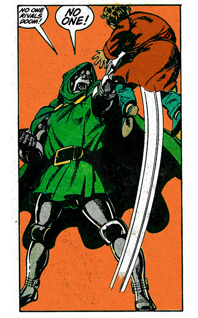 However, Byrne also illustrates that Doom is petty. As much as he wants to be seen as noble, he also wants to win. When that young boy suggests that Doom might find an equal in Magneto, the dictator brutalises the child he seemed to love not a moment ago. Although she’s talking about a Doombot, there is something of Doom in the way that he strikes Susan Storm when she gets in his way. “Yet, with his strange code of honour I’m shock that he would strike a woman,” Sue observes, “Kill one, yes, but I thought him above simple brutality.” Even if the real Doom would not have hurt Susan, a man “above simple brutality” does not hurt a child. It’s a complex and a fascinating portrayal.