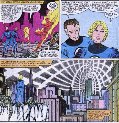 The Fantastic Four are so comfortable in themselves that they don’t even notice how surreal they must seem – perhaps Byrne commenting on how easily the “fantastic” can be rendered “mundane” through mere exposure. “Oh,” Sue remarks, realising that the priest couldn’t see her, and sounding like she forgot to ask him if he wants a cup of tea. “Sorry I startled you, Father. I’m afraid I’d quite forgotten I was still invisible.” We’ve been reading about these characters for over two-hundred issues, so it’s easy to take these things for granted.