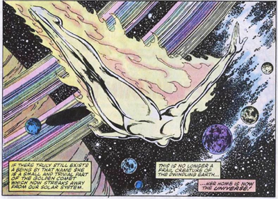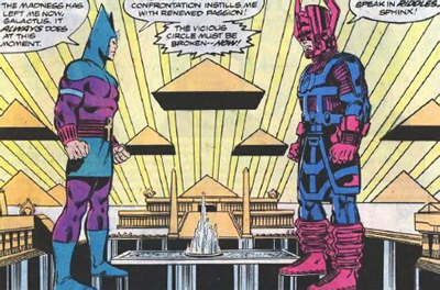 “Galactus is not a God,” Reed suggests at one point, “at least not as we define the concept, but he is nearly omniscient.” Arguably the differences are semantics, given his power over life and death. Arguably it’s only his complete indifference to smaller life forms that distinguishes him from the deities of the Marvel Universe. “I am Galactus!” he declares. “I am power which is beyond power, knowledge which is beyond thought!” Death describes the two of them as primal forces within the cosmos, “the shepherds who guide it to its proper purpose.” It’s a clever and a thoughtful portrayal, and something I really like about Byrne’s Fantastic Four. it’s also worth mentioning the fantastic chapter where Galactus lays siege to the Skrull Throneworld, a story which beautifully illustrates the destruction he causes as a mere matter of course.