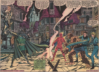 Continuing the theme, the twenty-fifth anniversary issue also defines the team by what they aren’t. The team find themselves living out mundane and boring (and “little”) live in tha appropriately-named Liddlesville. Though they have everything they could want, they each know that something is missing – they couldn’t be anything but the heroes they turned out to be. As Reed says, “We’ve all had a taste here in Liddleville of what it might have been like had we never become the Fantastic Four. But we are the Fantastic Four, Ben. And that means we have responsibilities.” In many ways, these early issues seem very aggressive in their attempts to define the Fantastic Four, and to assert what they are, by clearly illustrating what they are not.
