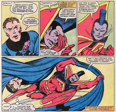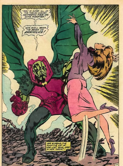 Maybe it’s a measure of consciousness, but it seems strange that the Fantastic Four are so indifferent to the risks of killing some Skrulls. I know they’re bad guys, but the team traditionally uses some measure of care not to fatally wound human villains. Instead, the Thing seems to use the fact that they’re Skrulls as an excuse to brutalise them. “See,” Ben states, “us good guys have a code that stops us from hurtin’ even bad guys too much… but when it comes to Skrulls… Hey, even Nazis are nicer than you creeps! So I don’t hafta hold back at all!” The Skrulls seem as self-aware as any other foes, so the brutality seems rather strange. And, given that the Skrulls are the race we see suffering from Reed’s decision to help Galactus, it’s an interesting point to make – if the Thing doesn’t feel too bad about brutalising them “too much” by virtue of their breed, will the Fantastic Four care too much about the death of their home planet?