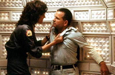 His body language during his confrontation with Ripley is no longer normal – he doesn’t act like a normal human being. In fact, it looks like he blew a circuit. His strange behaviour begins with his forced entry into “mother”, the womb-like room at the centre of the ship. His actions towards Ripley look uncomfortably like a sexual assault, right down to his bizarre attempt to asphyxiate her with a rolled-up phallic-shaped pornographic magazine. It that isn’t a whole cluster of Freudian symbology, I don’t know what is. Suddenly, after spending the whole movie detached and impersonal, he seems to become a sexually violent predator – not too far removed from the alien spawned from Kane.