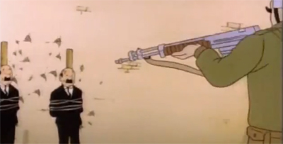 There’s quite a lot missing here, but most of it is hinted at by what remains. For example, while we’re spared that wonderful shot of the slums as the gang arrive, it is present as they leave. However, while hinting that Tintin’s revolution has done little to improve the standard of living for the ordinary people of San Theodoros, the moment lacks a sense of symmetry. It isn’t clear that things are bad no matter who is in charge, purely because of the cycle of perpetual violence as leaders fight for scraps. The image is there, but the context is lost.
