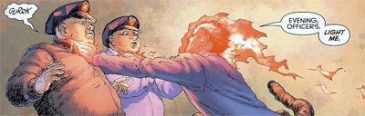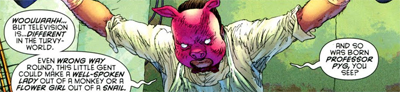 The Flamingo is the Joker as a primal force of nature rather than a philosophical position. When the character appears, he just grunts and laughs at the pain he is causing and experiencing (“heh heh heh”). His purple attire and sinister grinning demeanour bring to mind the Joker. The Flamingo wasn’t always a monster – he was lobotomized and converted to one, in the same way the Joker was drowned in a vat of chemicals. I doubt it’s a coincidence that Morrison uses the two techniques of controlling the behaviour of the mentally ill as central gimmicks of two of his new villains (with lobotomy a favoured tool in the nineteenth century and psychopharmacology developing afterwards).