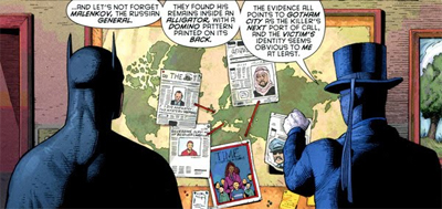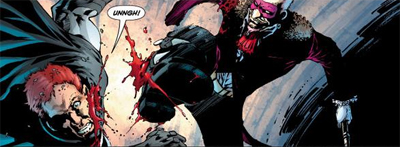 There are the obvious thematic comparisons. The Red Hood has ties to both the legacy of Robin through Jason Todd and the Joker through Alan Moore’s The Killing Joke. The “zombie Batman” from Blackest Knight is a pale and decaying adversary who shares the tragedy of Batman’s origin, but his sanity cannot withstand the pressure – reflecting the observation that Batman has channeled his psychological trauma into something reasonably constructive, but the Joker hasn’t. Oberon Sexton is a match for Batman in terms of intelligence and sophistication, and yet his black mask renders him anonymous – much like the Joker arguably exists as a constant, but without any real identity of himself (in fact Morrison theorises there is no “real” Joker, as he reinvents himself continuously). Indeed, perhaps Oberon Sexton, with his dark outfit and serious manner, reflects the Joker’s “tribute” to his fallen adversary. Note that Oberon, before the reveal, has the exact same origin as the Joker from Alan Moore’s The Killing Joke as elaborated upon during the Pushback arc in Gotham Knights (“his face was scarred by criminals who killed his wife”).